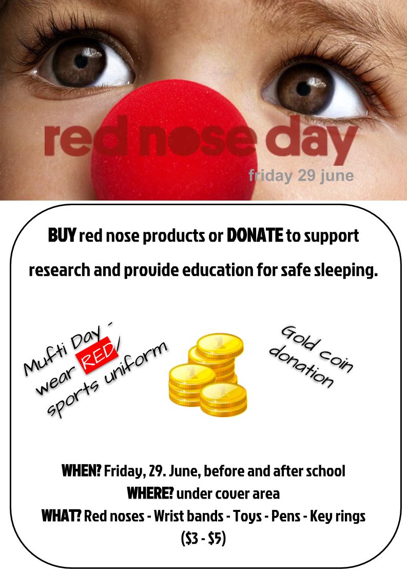 Support Red Nose and help reduce nine deaths a day to zero. We’ll be selling red nose merchandise before and after school (between $3 – $6), so please bring along a few dollars in your pocket to help this amazing cause.