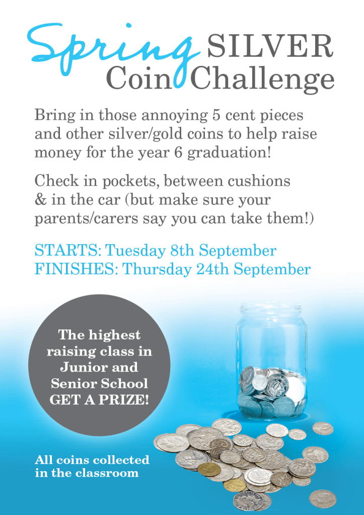 Bring in those annoying coins from under the car seats and in the couch cushions to help fundraise for the Y6 Graduation. Highest raising Senior and Junior classes get a prize!
