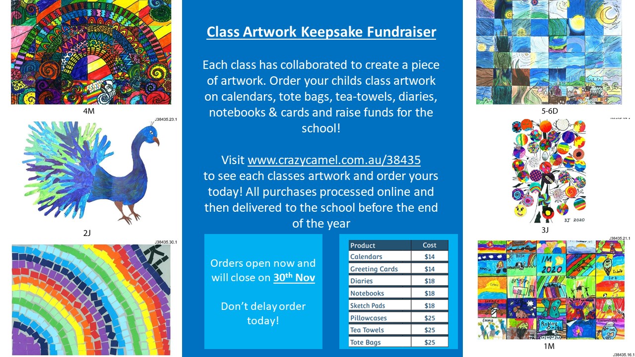 Visit www.crazycamel.com.au/38435 to see each classes artwork and order yours today! All purchases processed online and then delivered to the school before the end of the year.