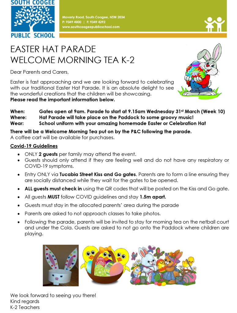 We are very excited to have our first event in 12 months at school! The K-2 Welcome Morning Tea will run after the Easter Hat Parade on Wednesday 31st March. The morning tea is for parents only, and will be put on by the P&C.