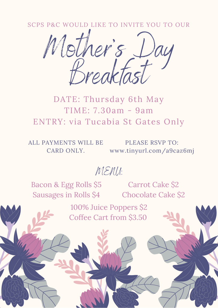 We are very excited to be able to hold our Mothers Day Breakfast once again, celebrating all the mothers, grandmothers, aunties, and other wonderful carers in our school community. ALL WELCOME 🙂