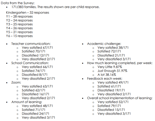 Thank you for your feedback in our recent ’Parent – Learning From Home’ survey on your experience of learning at home and the resources our school is providing. This survey is an important part of our evaluation and planning process. The teachers and learners will have surveys shortly. Thank you for engaging and sharing your thoughts. We have read through all comments taking into consideration the varied range of ideas and opinion. We will take all observations into further ‘Learning From Home’ planning. Below are our parent responses.