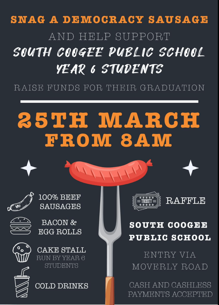 It is just under a week now until the first major fundraiser of the year, the NSW Election BBQ on 25 March. Please come and vote at the school, and whilst you are there grab a sausage sizzle, bacon and egg roll, cake or raffle ticket. This is a great chance to represent our school to the wider voting public, and also raise funds for the Year 6 graduation. We need some help to make this event a massive success, so please consider getting involved.