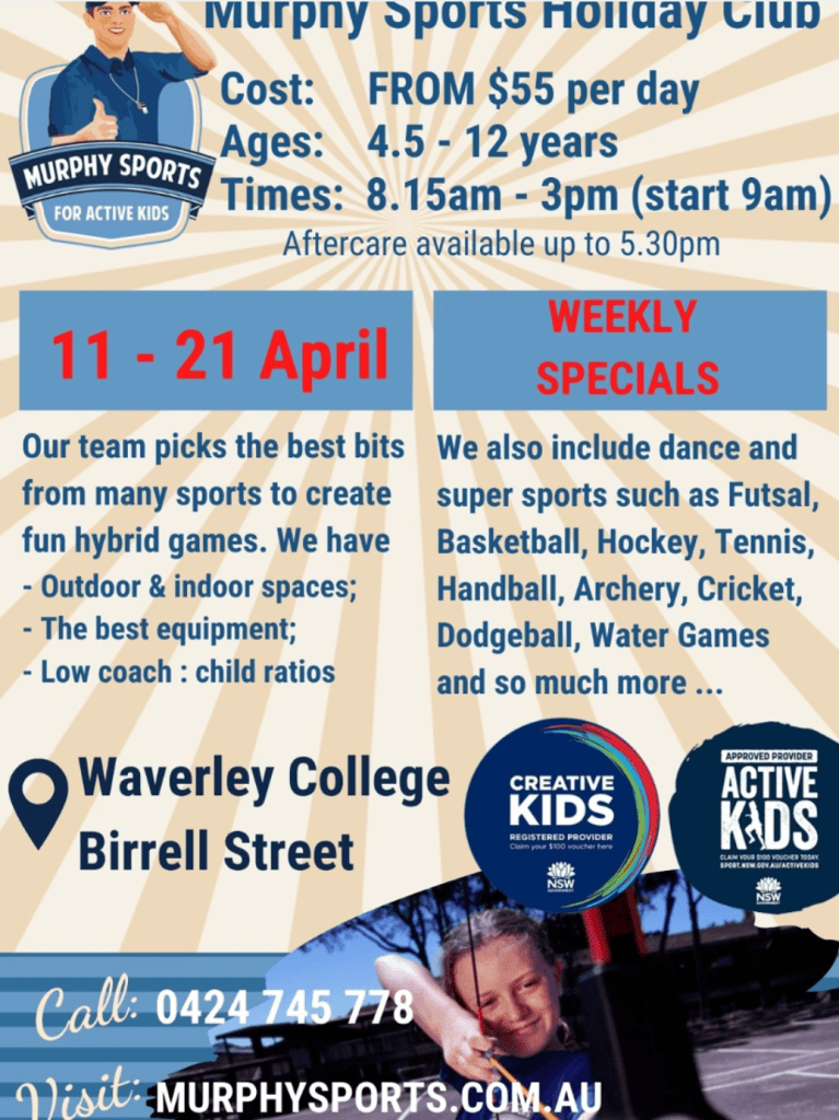 There is also a free AFL holiday camp on Tuesday 18th April at Moore Park