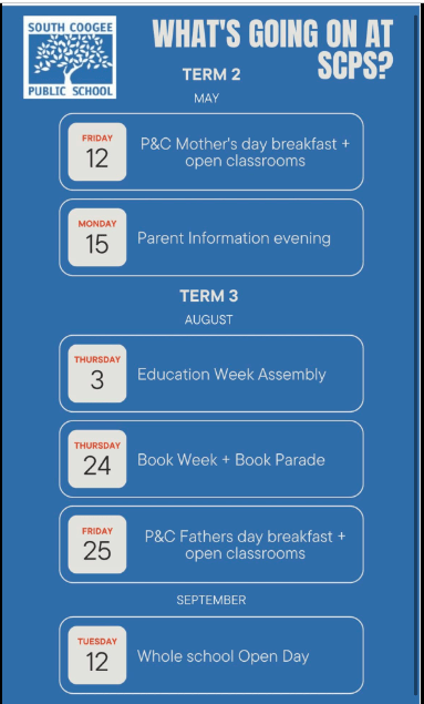 The first event of the term will be the Mother’s Day breakfast on Friday 12th May 8-9am, followed by open classrooms so parents and carers can have a look at their child’s learning environments and work.