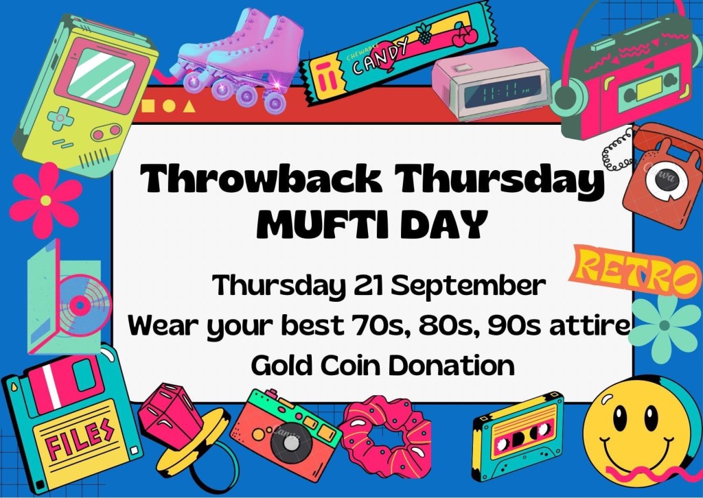This Thursday is MUFTI Day, so please don’t forget to get kitted out in some rad clothes – perhaps neon, hypercolour, double denim, leg warmers, crimping, flower power, flares – so many options!