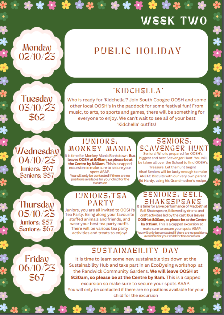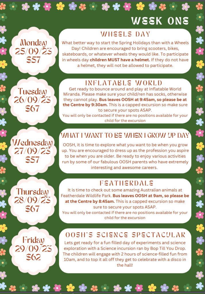 Firstly my apologies for only releasing two newsletters this term, the P&C have been very busy leading several events and suddenly its week 10! I hope everyone has a great spring school holiday, some ideas for last minute vacation cares are listed below.
