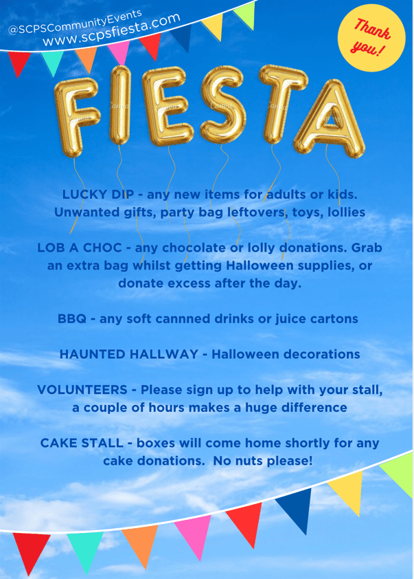 Also a MASSIVE thank you to everyone that is donating vouchers and prizes. We really can’t run this event without a huge amount of support. Please check out the list here (we are adding more every day) and next time you visit a store mention you saw them at the SCPS Fiesta. Lets show support for those that support our kids! Please also follow #scpscommunityevents on insta or facebook and like and share posts.