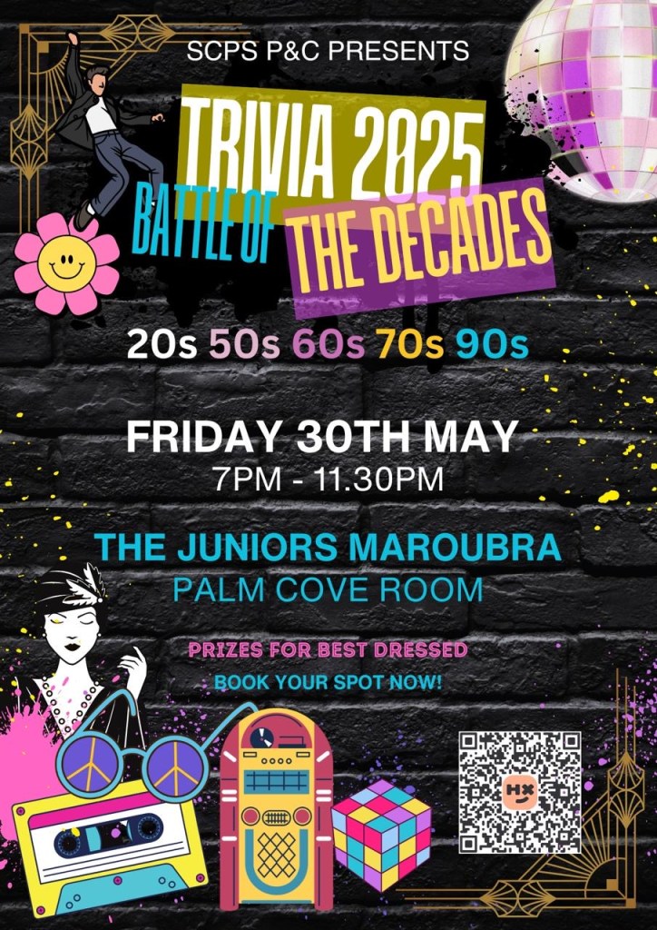 Tickets are selling FAST, so secure your table now via this link. https://events.humanitix.com/scps-p-and-c-battle-of-the-decades-trivia-night