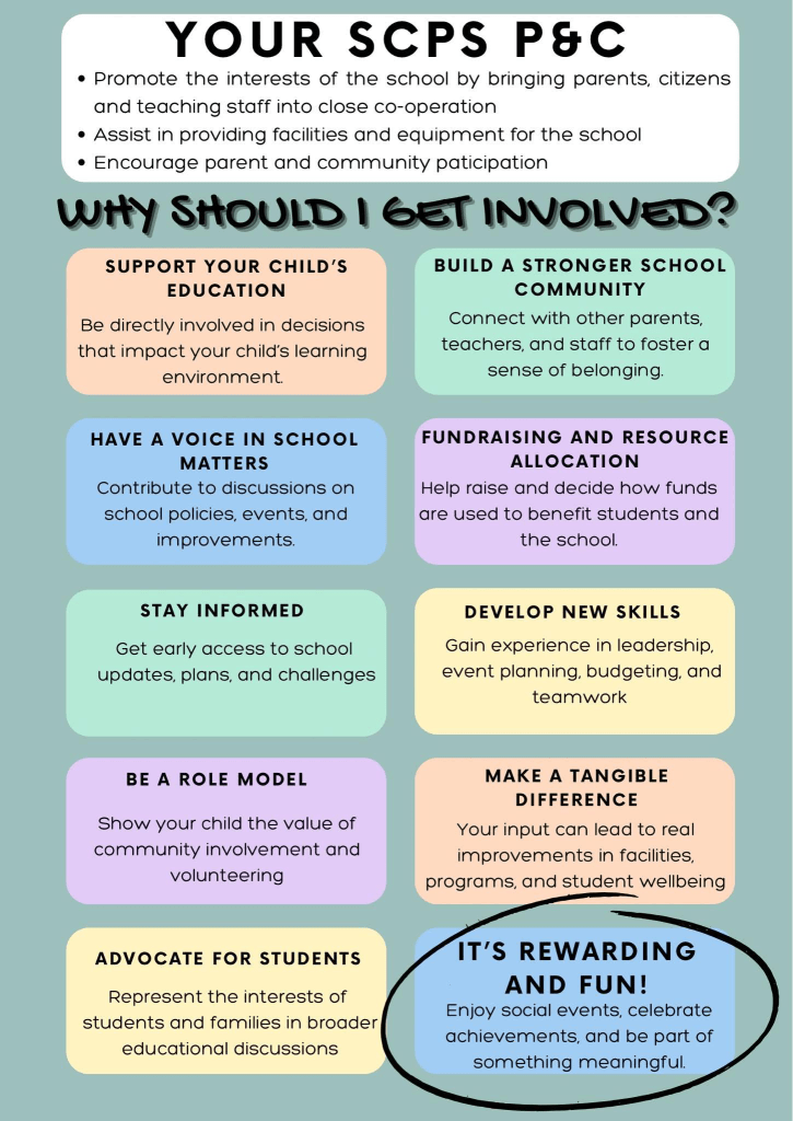 Being part of the P&C gives you a voice in school matters, supports your child’s education, helps you develop new skills, and keeps you informed. Plus—it’s genuinely rewarding and yes, even fun!